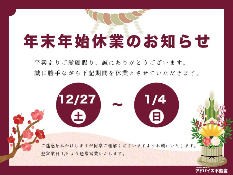 私たちアドバイス不動産は、休業中にしっかりと英気を養い、新年からはさらにパワーアップした知識とホスピタリティをもって、皆様の「安心」と「成功」に繋がるアドバイスをお届けできるよう、誠心誠意努めてまいります。